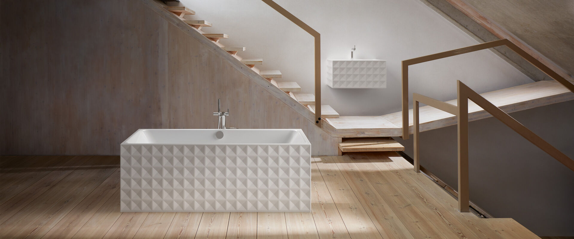 Der minimalistische Korpus der Badewanne wird durch die geometrische Verkleidung sanft aufgelockert – und sorgt für ein faszinierendes Spiel mit Licht und Schatten. Entworfen wurde BetteLoft Ornament vom Potsdamer Designbüro Terreraux + Partner, 2018 erhielt die Luxusbadewanne den German Design Award. Hinter der ausdrucksstarken Fassade steckt die charakteristische Innenformform der BetteLoft Serie: Vier großzügige Flächen, die konisch aufeinander zulaufen, sorgen für angenehmen Liegekomfort und genussvolle Badeerlebnisse.