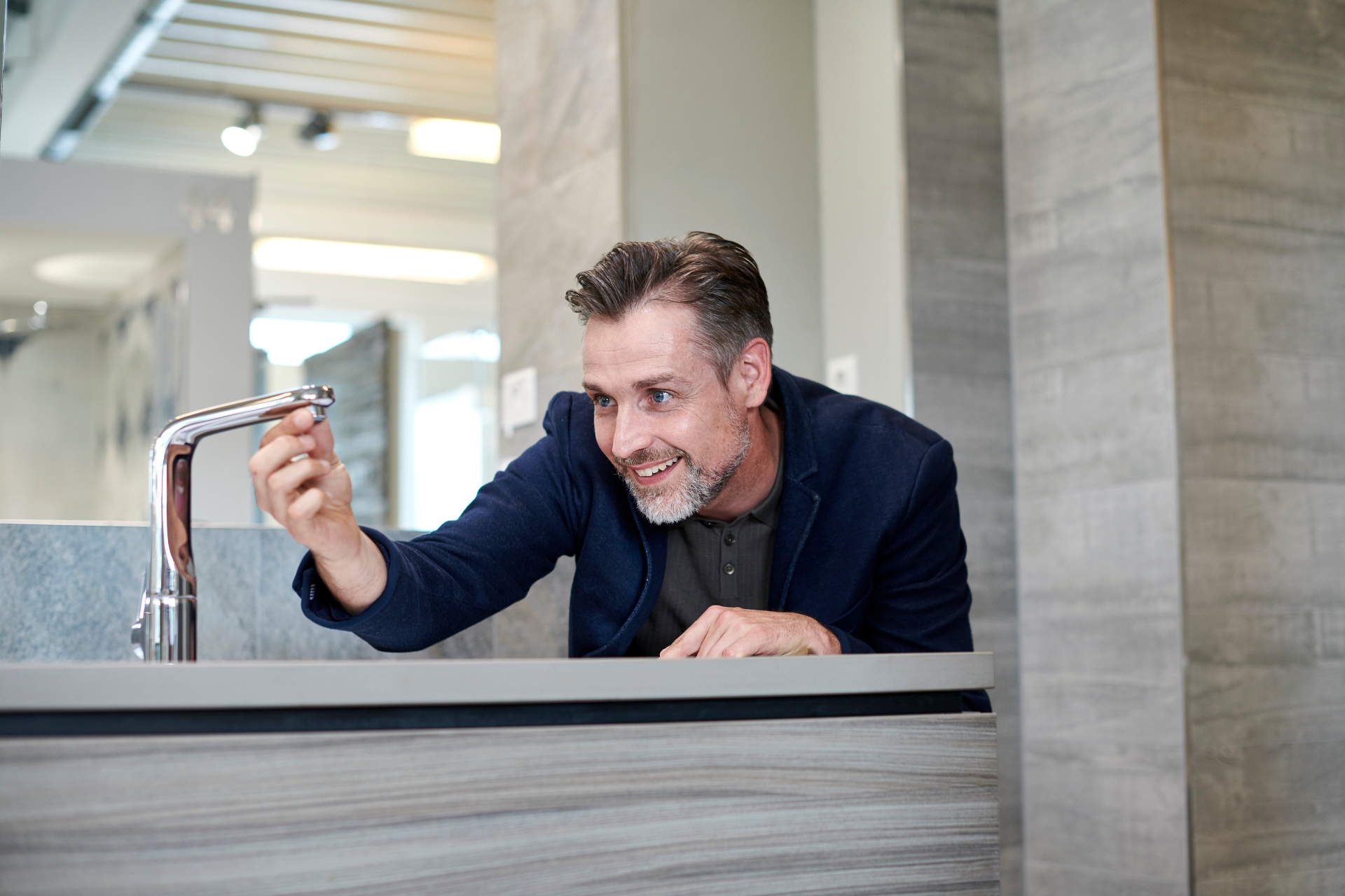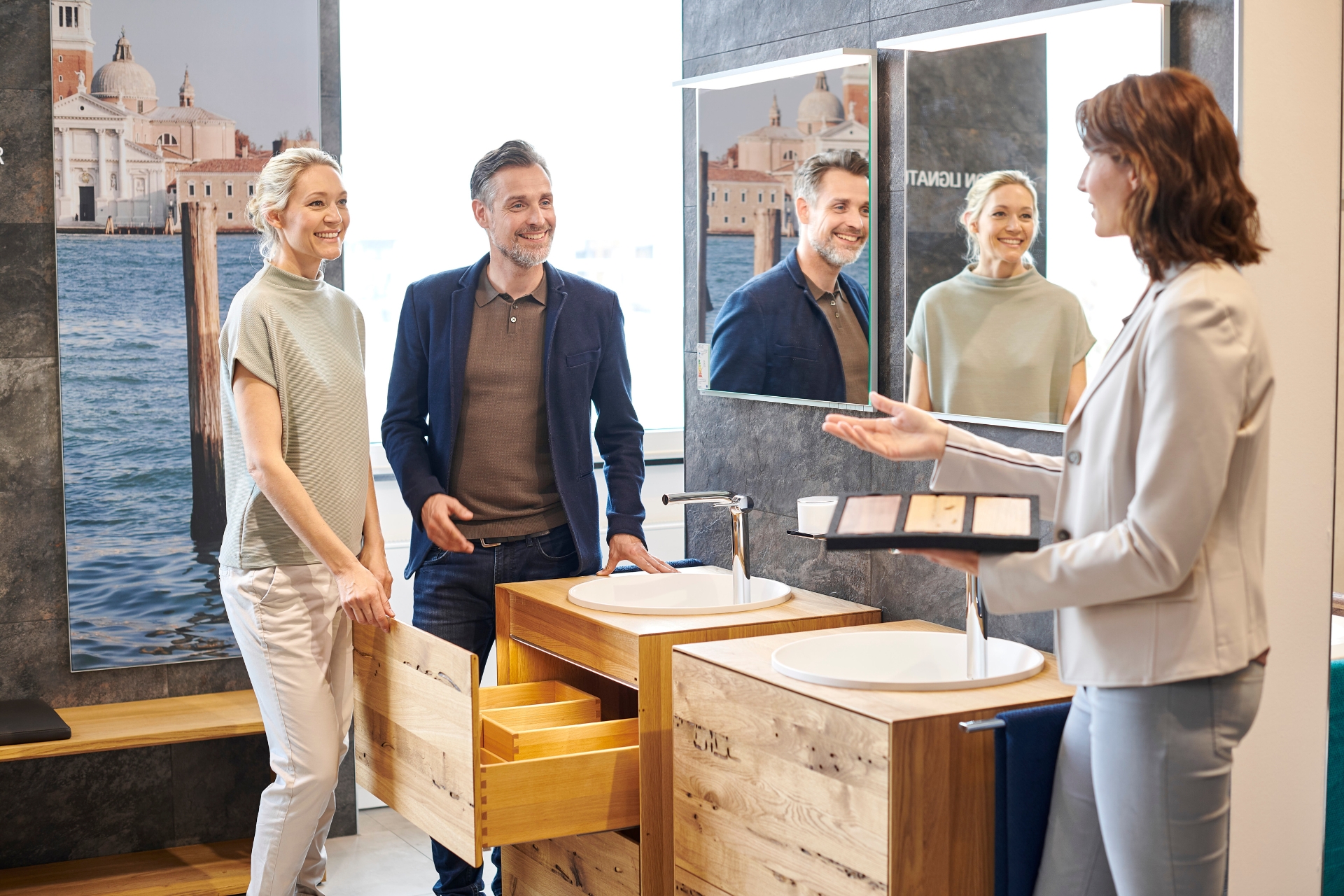 Der Handel bietet vielfältige, authentische Erlebnisräume statt einem anonymen Online-Shop. Hier ist echte Berührung möglich: Materialien spüren, Farbnuancen sehen oder das Dusch-WC live testen.