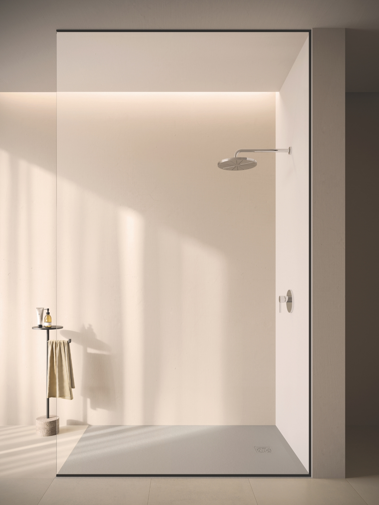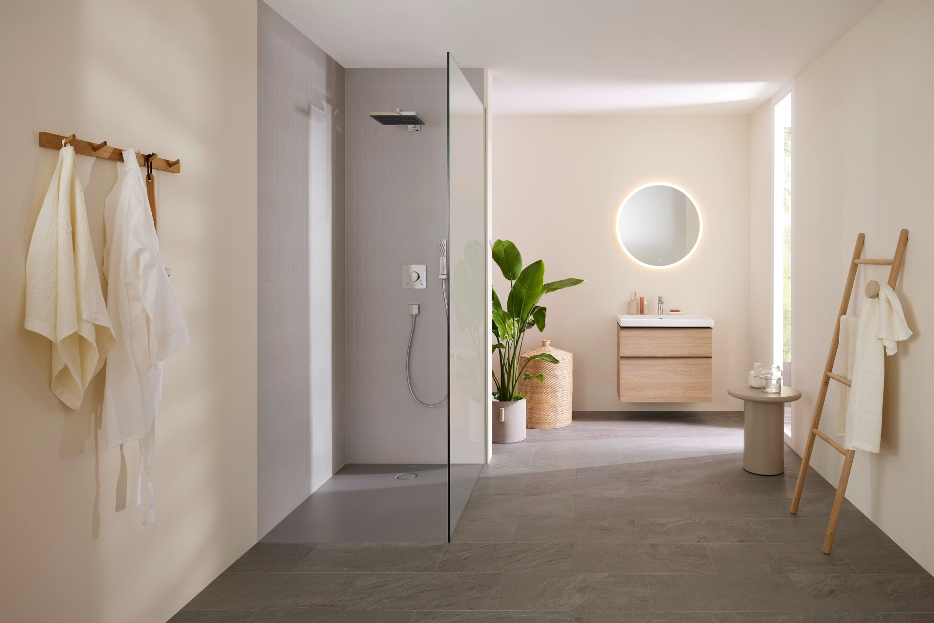 Helligkeit, Klarheit und fließende Übergänge prägen dieses Badezimmerkonzept im Zeichen von LIGHT. Tageslicht, helle Flächen und natürliche Akzente aus Holz und Grün schaffen eine ruhige, offene Atmosphäre, in der der Raum leicht und aufgeräumt wirkt. Die bodenebene Walk-in-Dusche öffnet das Bad optisch und unterstützt das Gefühl von Weite und Leichtigkeit. Mit CleanFloor30 zeigt Geberit eine elegante Lösung, die Design und Funktion harmonisch verbindet. Die dezente Linienführung fügt sich unauffällig in den Boden ein und unterstreicht die reduzierte Gestaltung. Als Teil eines ganzheitlichen Badkonzepts steht CleanFloor30 für eine klare Ästhetik, die Ruhe vermittelt und den Anspruch von LIGHT konsequent weiterdenkt. Geberit bietet damit Lösungen, die das Badezimmer als stimmigen, lichtdurchfluteten Lebensraum erlebbar machen.