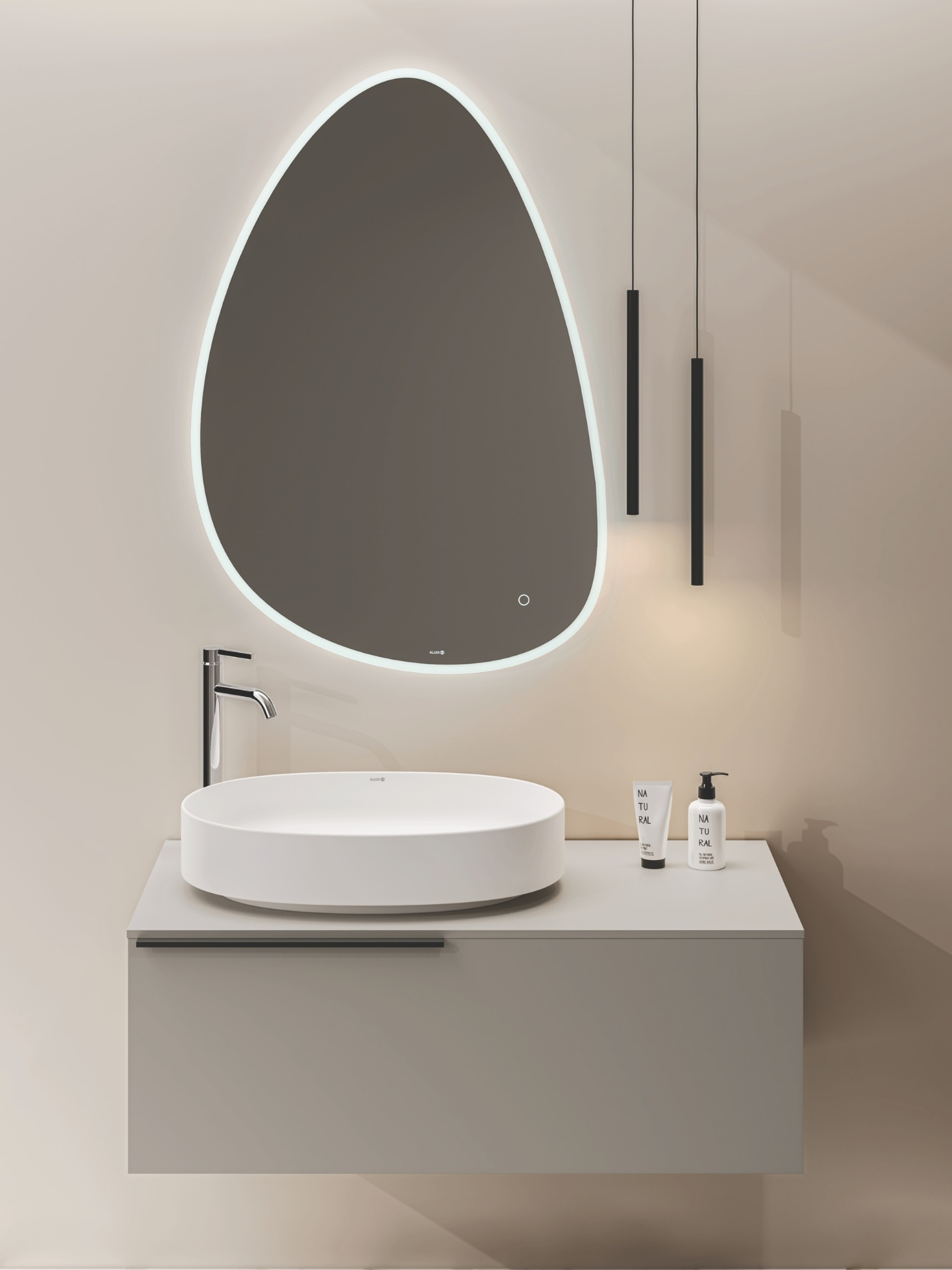Weiche Linien und fließende Formen prägen den LUMA Spiegel und bringen eine sanfte Dynamik in das LIGHT Bad. Die organische Silhouette wirkt leicht und natürlich, bricht strenge Geometrien auf und unterstützt eine Gestaltung, die Ruhe und Offenheit ausstrahlt. In hellen Badezimmern entfaltet der Spiegel seine besondere Wirkung, indem er Licht aufnimmt und den Raum optisch erweitert. Mit LUMA ergänzt KLUDI den Waschbereich um ein Gestaltungselement, das Funktion und Atmosphäre verbindet. Die klare Ausführung und die zurückhaltende Präsenz machen den Spiegel zu einem ruhigen Mittelpunkt, der den LIGHT Trend mit sanfter Eleganz interpretiert.